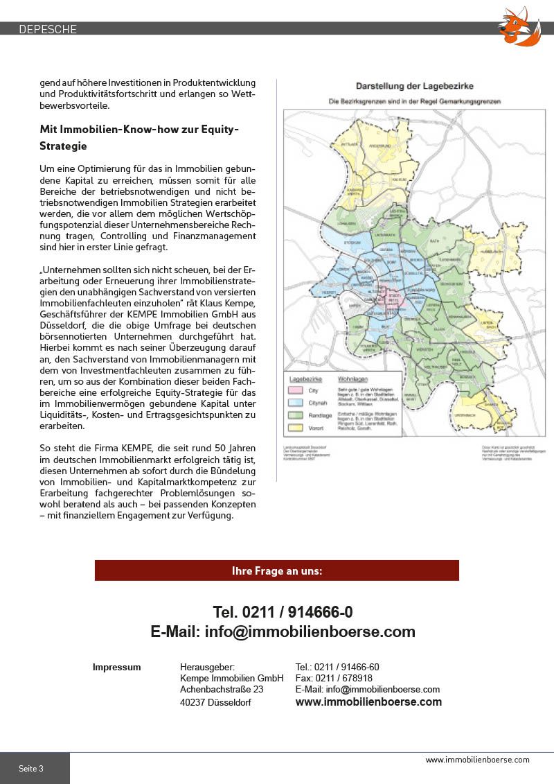 „Unternehmen sollten sich nicht scheuen, bei der Erarbeitung oder Erneuerung ihrer Immobilienstrategien den unabhängigen Sachverstand von versierten Immobilienfachleuten einzuholen“ rät Klaus Kempe, Geschäftsführer der KEMPE Immobilien GmbH aus Düsseldorf, die die obige Umfrage bei deutschen börsennotierten Unternehmen durchgeführt hat. Hierbei kommt es nach seiner Überzeugung darauf an, den Sachverstand von Immobilienmanagern mit dem von Investmentfachleuten zusammen zu führen, um so aus der Kombination dieser beiden Fachbereiche eine erfolgreiche Equity-Strategie für das im Immobilienvermögen gebundene Kapital unter Liquiditäts-, Kosten- und Ertragsgesichtspunkten zu erarbeiten.