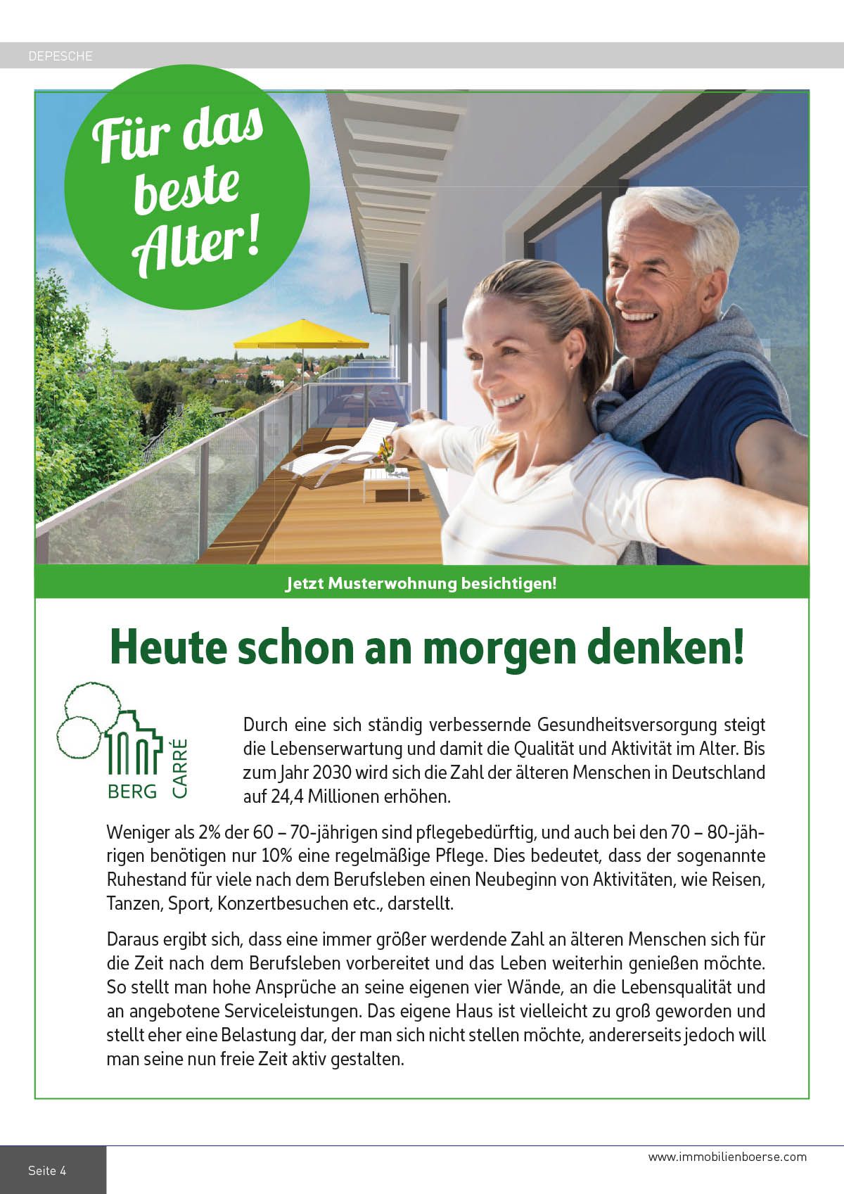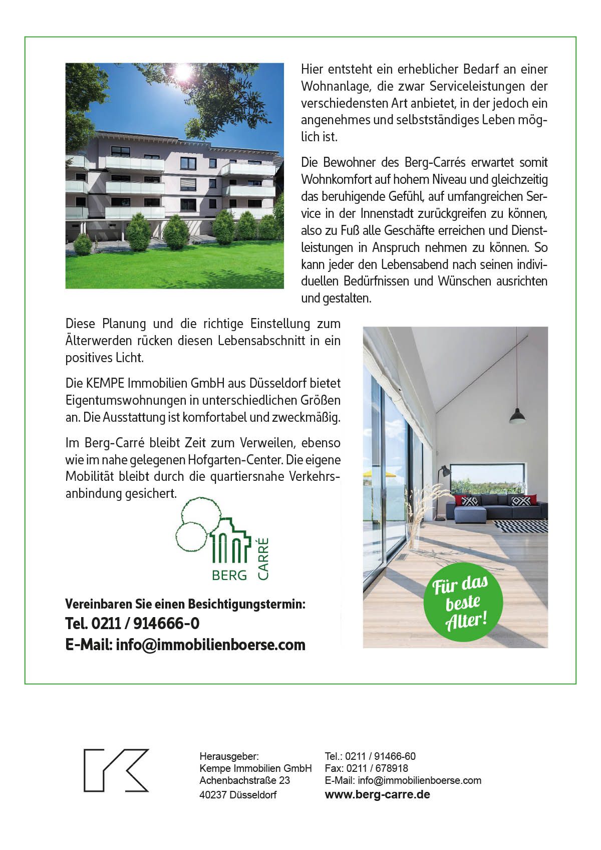 Die Bewohner des Berg-Carrés erwartet somit Wohnkomfort auf hohem Niveau und gleichzeitig das beruhigende Gefühl, auf umfangreichen Service in der Innenstadt zurückgreifen zu können, also zu Fuß alle Geschäfte erreichen und Dienstleistungen in Anspruch nehmen zu können. So kann jeder den Lebensabend nach seinen individuellen Bedürfnissen und Wünschen ausrichten und gestalten. Diese Planung und die richtige Einstellung zum Älterwerden rücken diesen Lebensabschnitt in ein positives Licht.